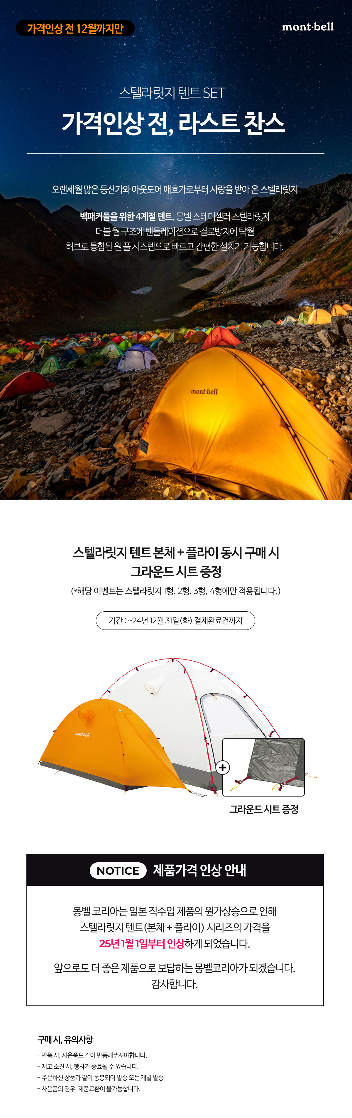 (행시종료) 스텔라릿지 텐트 SET 가격인상 전, 라스트 찬스 / 12월까지만 > 몽벨