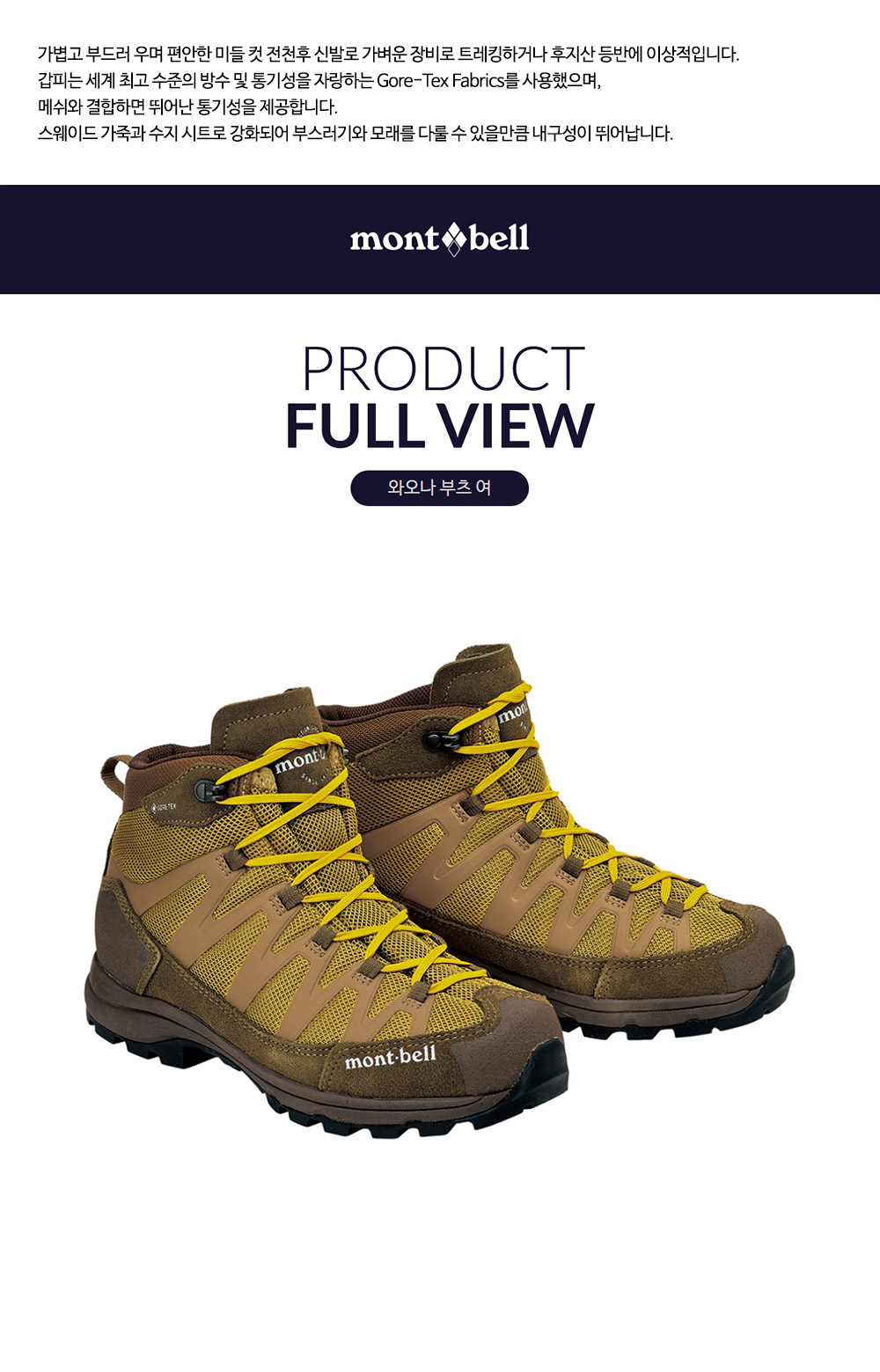 가볍고 부드러운 편안함과 뛰어난 착용감의 미들 컷 전천후 신발로 가벼운 장비로 트레킹하는데 이상적이며 GORE-TEX 원단을 사용하여 뛰어난 통기성을 제공